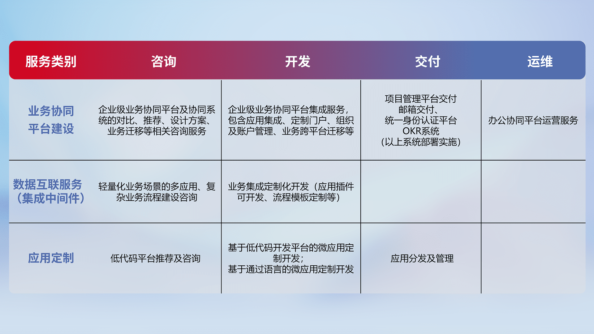 针对钉钉、、、企微、、IDaas等平台级产品提供产品的规划、、方案、、、、交付、、、、定制化开发等服务,,实现如统一协同办公、、、智能客户服务、、、混合会议管理、、、、智能数据查询、、、等业务场景,,,实现数字化转型。。。。